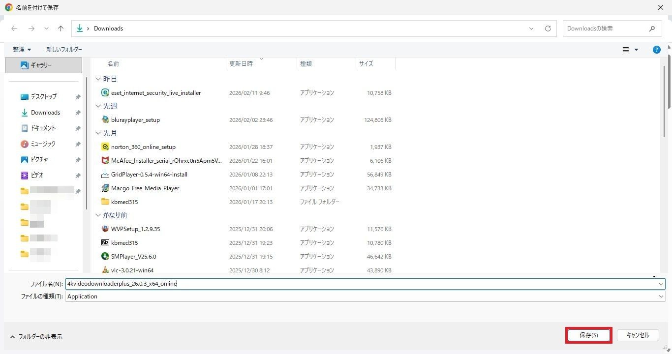 4kvideodownloaderplus_26.0.3_x64_onlineのダウンロードを開始します。保存を1回左クリックしてください。バージョンなどによって数字が異なる場合があります。