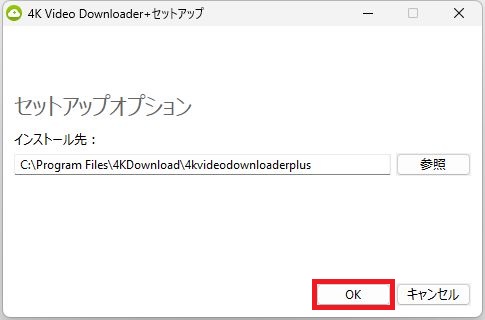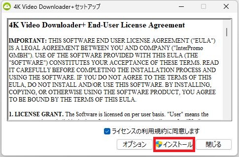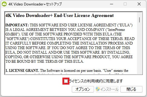4Kビデオダウンローダー+エンドユーザーライセンス契約が表示されます。オプションはどこにインストールをおこなうかという部分になります。確認されたい場合はオプションを1回左クリックしてください。