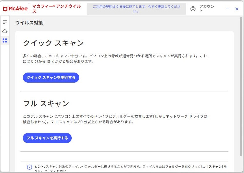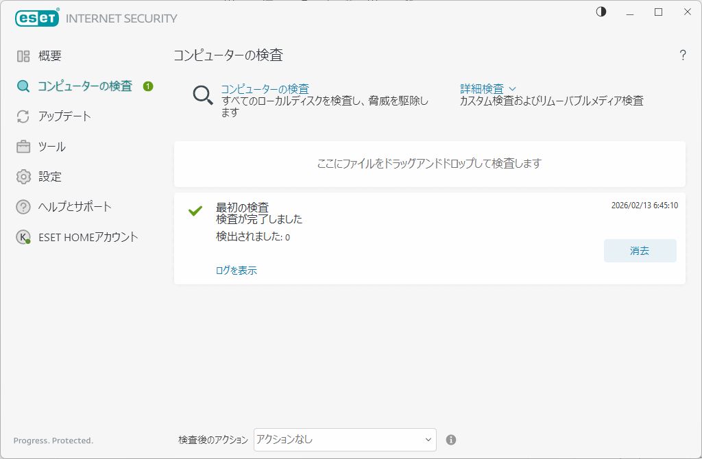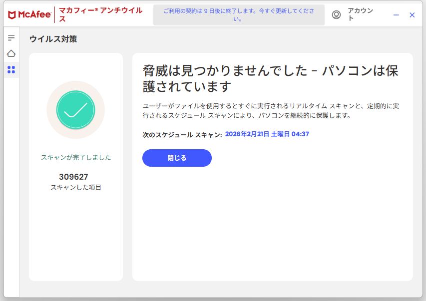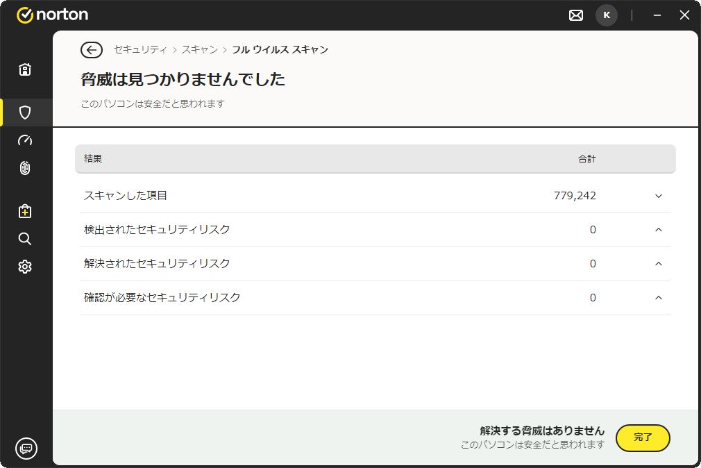 ウイルスの検査結果については脅威は見つかりませんでしたという表示でした。