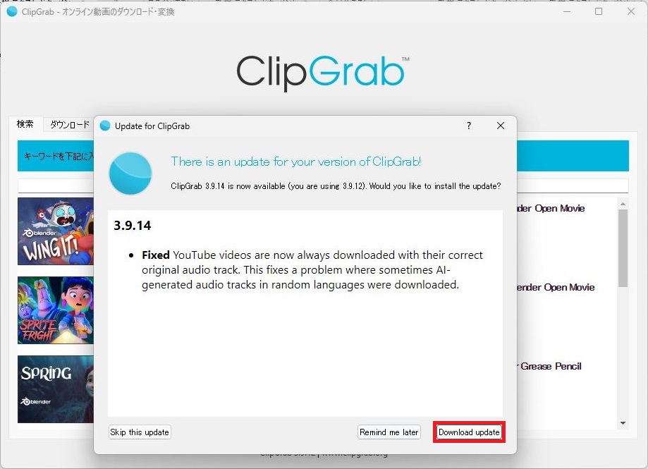 Google日本語訳:ClipGrab 3.9.14が利用可能になりました(現在3.9.12をご利用中です)。アップデートしますか?