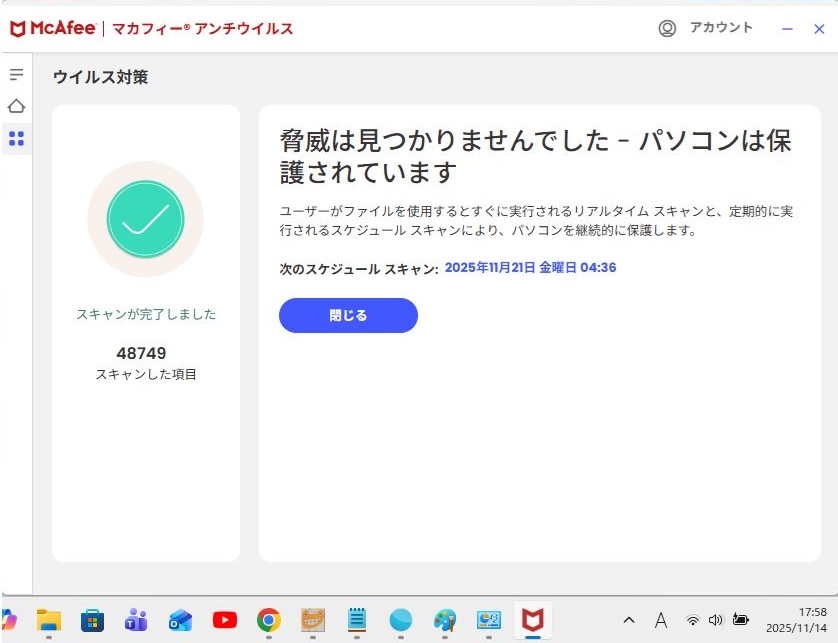 アップデートをおこなった後にマカフィーで問題があるファイルがないかウイルスチェックをおこなってみましたが問題はありませんでした。