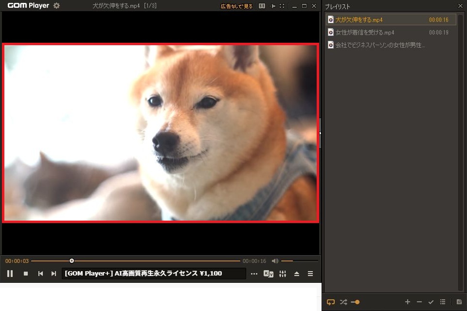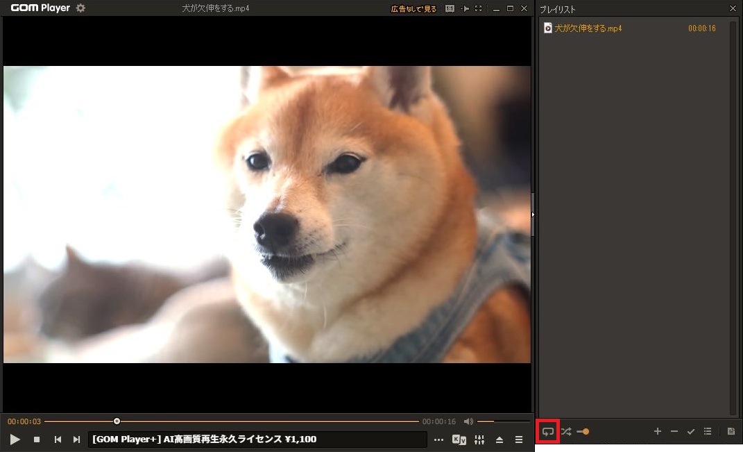 例として犬が欠伸をしているファイルがリピートで再生されます。