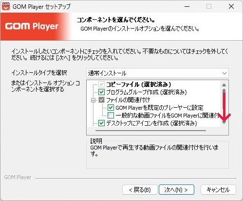 インストールをおこなうコンポーネントを選択します。不要なものにはチェックを外してください。という記載があります。右側のカーソルを使用して下に移動してください。