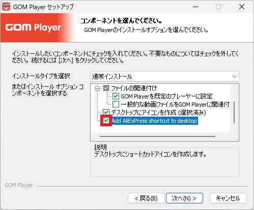 - チェックを付けた状態でGOM Playerのインストールをおこなうとデスクトップ上にaliexpressのショートカットアイコンが表示されます。
