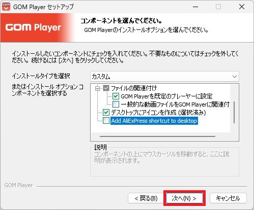 - GOM playerのインストールの方法はこちらのページ内に記載がしてある方法です。GOM playerのインストール時のAdd Aliexpress shorttcut to desktopのチェックを外すしてインストールをしていない状態、その他に紹介されていたソフトウェアもインストールがされていない状態です。
