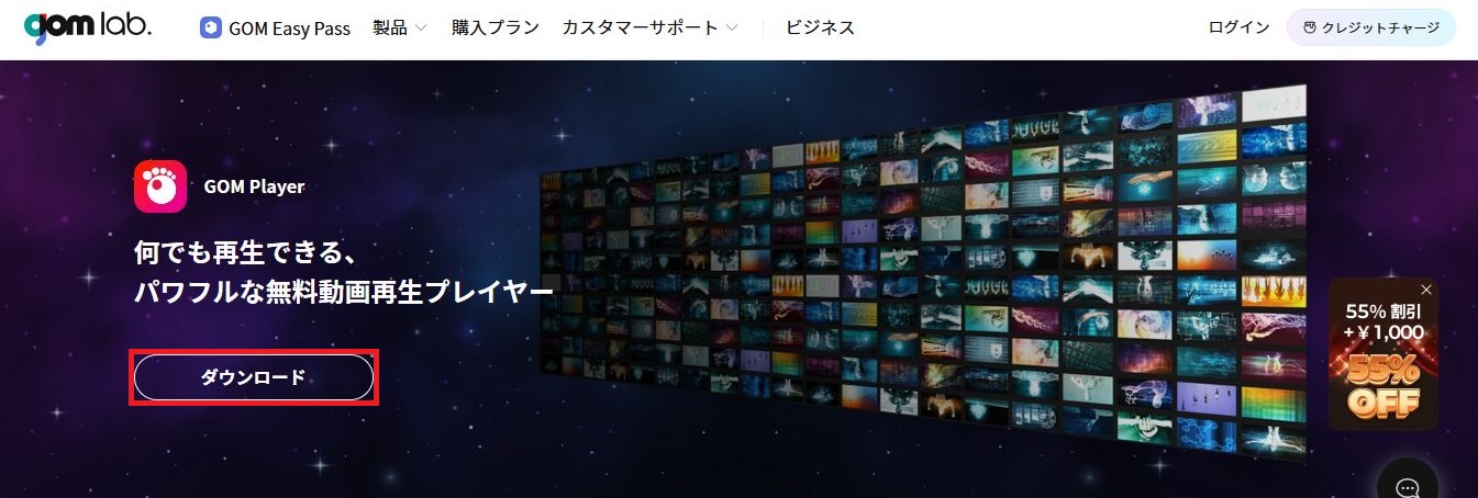 GOM Playerの公式サイト(https://www.gomlab.com/jp/gomplayer-media-player)にアクセスし「ダウンロード」を1回左クリックしてください。