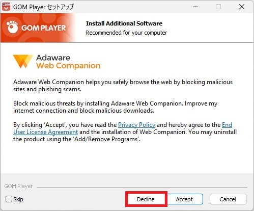 - Dedine(同意しない)を選択するとAdawareがインストールされません。