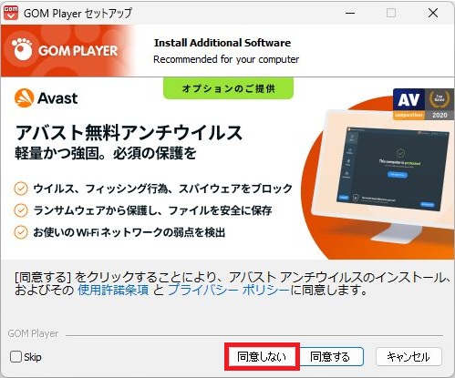 - 同意しないを選択するとアバウト無料アンチウイルスがインストールされません。