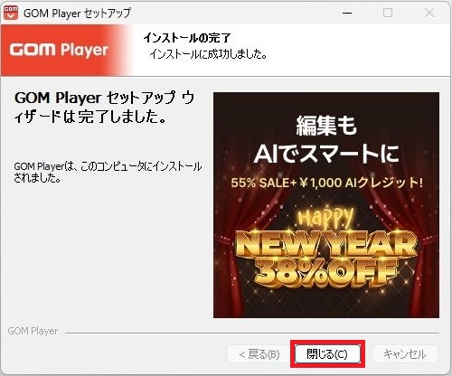 GOMPLAYER セットアップウェザードは完了しました。という表示がされます。「閉じる」を1回左クリックしてください。