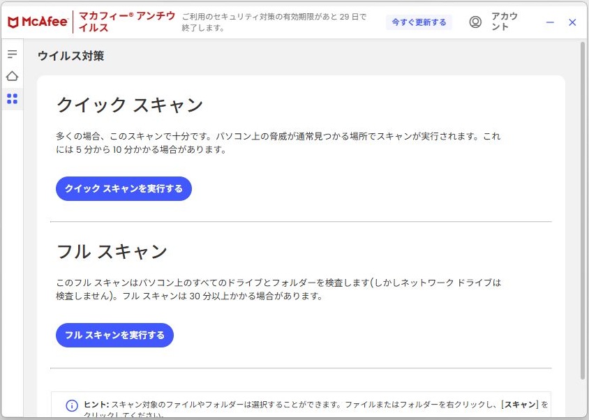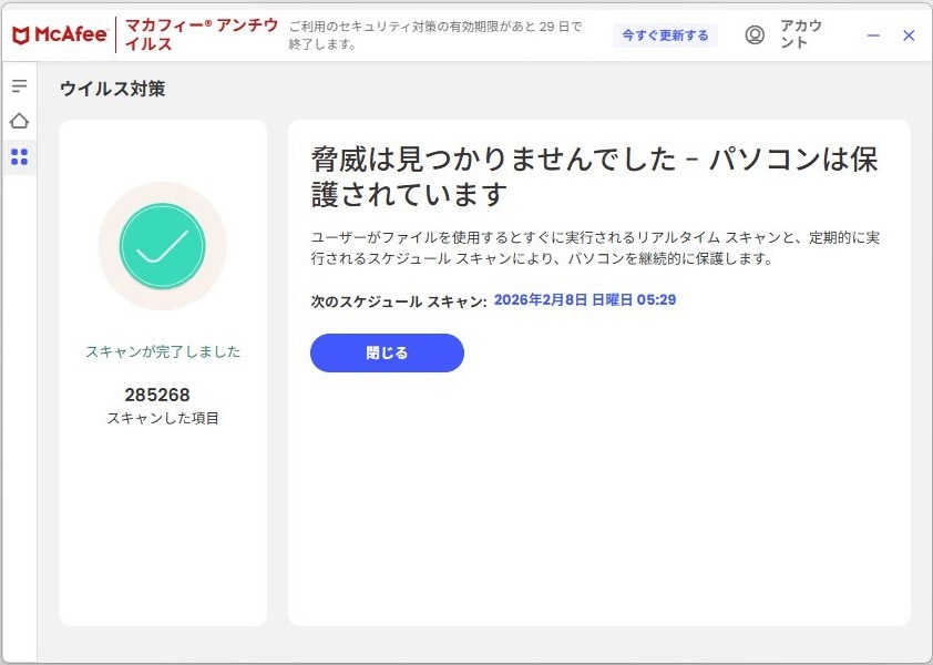 McAfeeのフルスキャンでウイルスチェックをおこなっています。ウイルスの検査結果については脅威は見つかりませんでしたという表示でした。