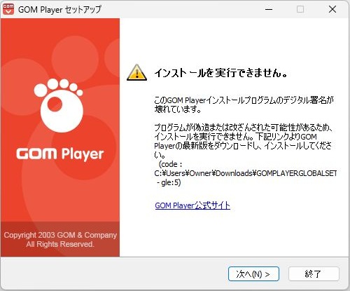 GOM Playerのインストールをおこなう際にインストールを実行できませんという表示がでます。デジタル署名が壊れていますという表示が出たのはesetのみです(3回ほど繰り返し3回ともデジタル署名の部分が壊れていることを確認しています)