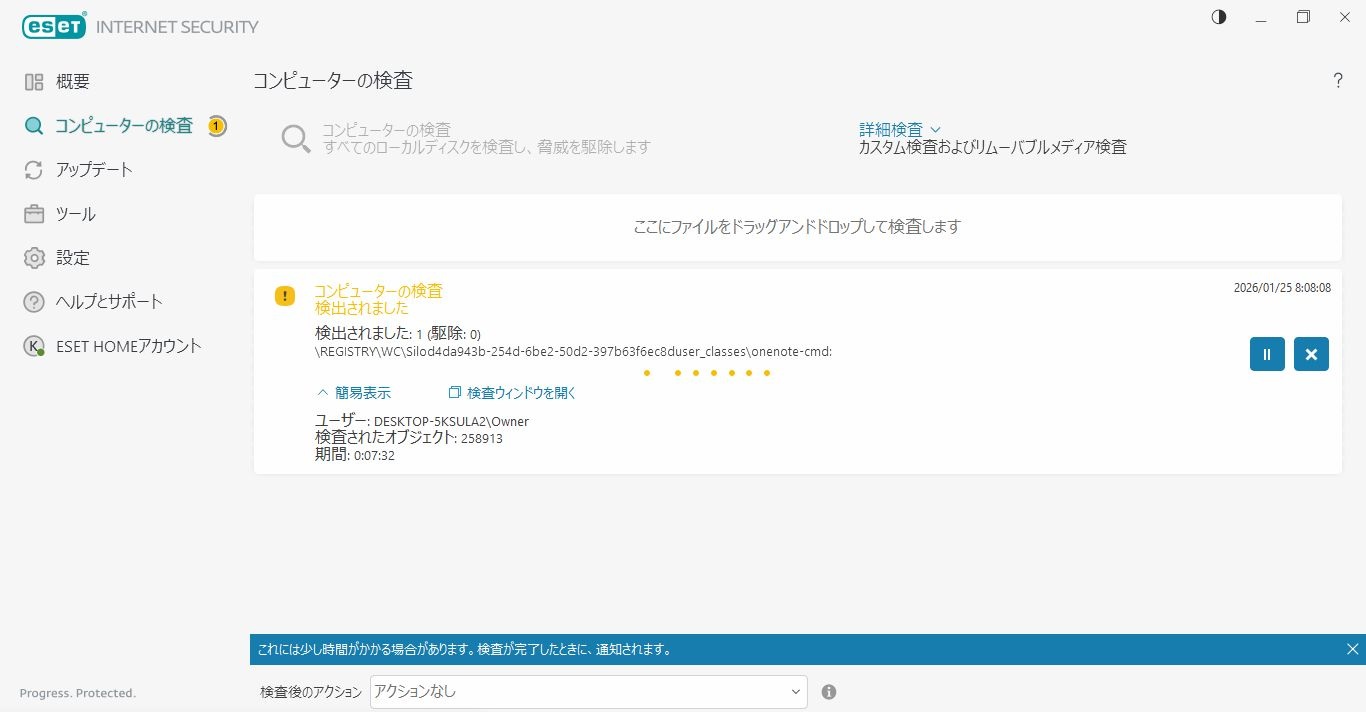 初めにesetのコンピューターの検査という項目でウイルスチェックをおこなっています。その際に問題もしくは脅威の可能性があるファイルが発見された場合には削除をおこなっています。その後に以下のことをおこなっています。
