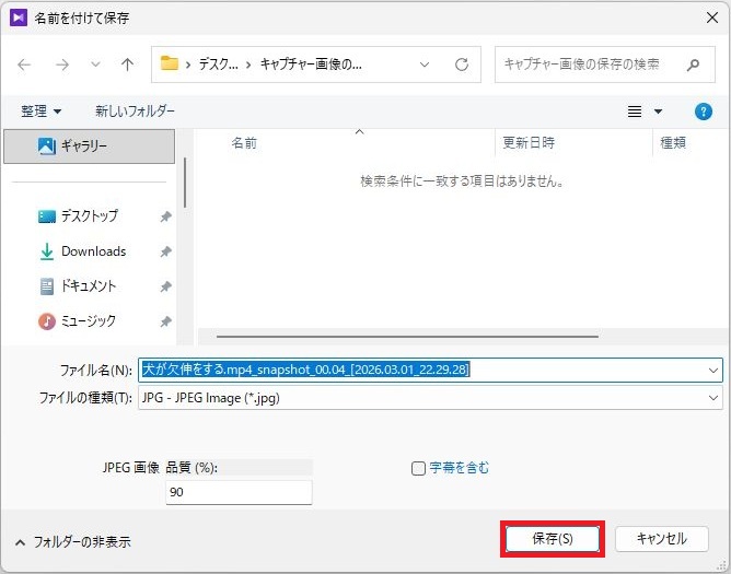 キャプチャーされた画像の保存先が表示されます。ファイル名、保存先を変更されない場合は、保存を1回クリックしてください。これでキャプチャーは完了です。