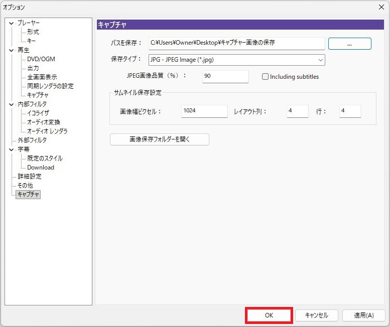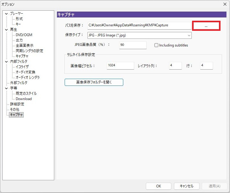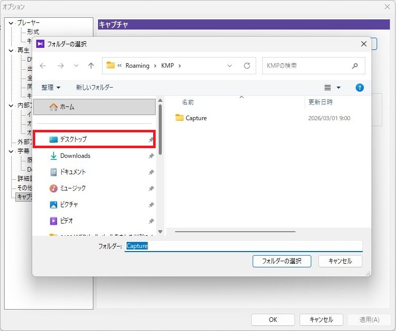 KMplayerでキャプチャーをおこなった場合、キャプチャー画像の保存先がWindows11の例としてWindows:C→ユーザー→Owner→AppData→Roaming→KMP→Capという複雑な場所に画像が保存されますので先にフォルダの変更をされることをおすすめします。
