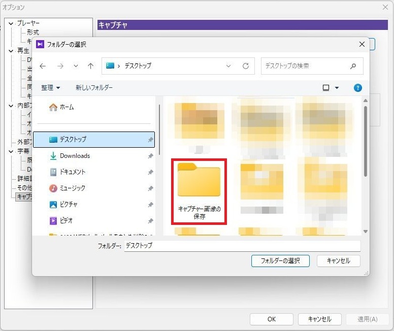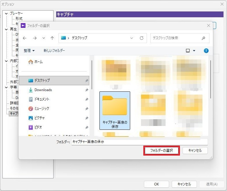例としてキャプチャー画像の保存という名称にしてあります。保存されたいフォルダ名を1回左クリックしてください。