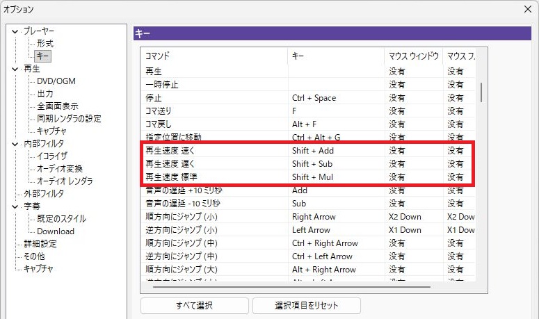 • 「再生速度-遅く」する場合は、Shift+Subを押してください。