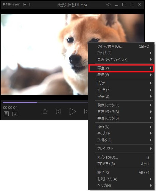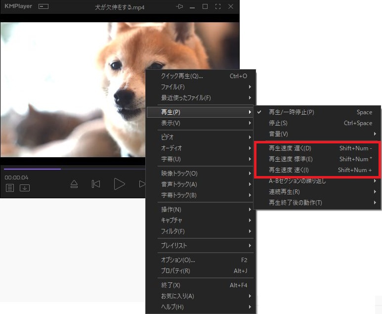 KMplayerのメニュー画面(マウス操作)で動画の再生速度を早くする(倍速)、遅くする(スロー)の操作をおこなう場合は、