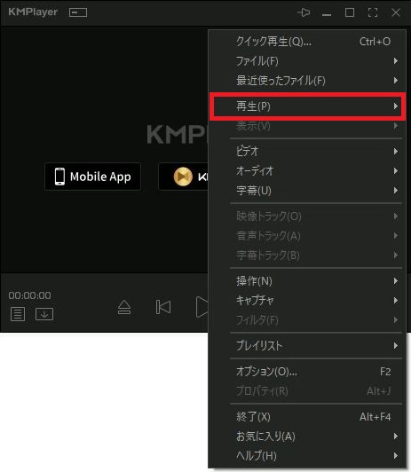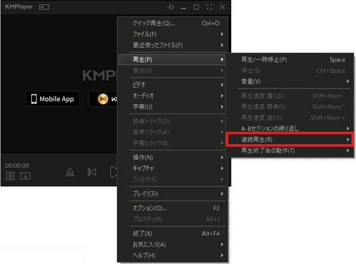 KMplayerで動画のリピート再生(連続再生)の操作をメニュー画面(マウス操作)でおこなう場合は、