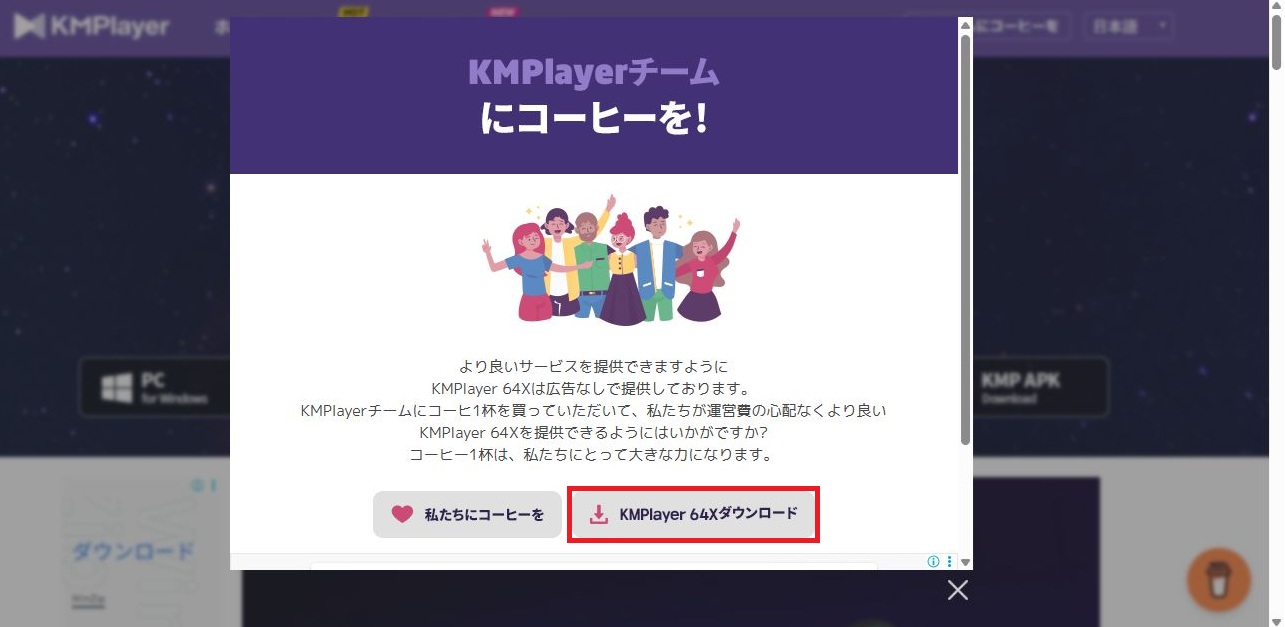 募金の表示がされます。募金をされないと一部の機能が使用できないといったことはありません。募金をされない方は、そのままKMplayer64xダウンロードを1回左クリックしてください。