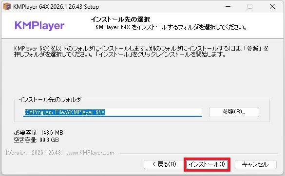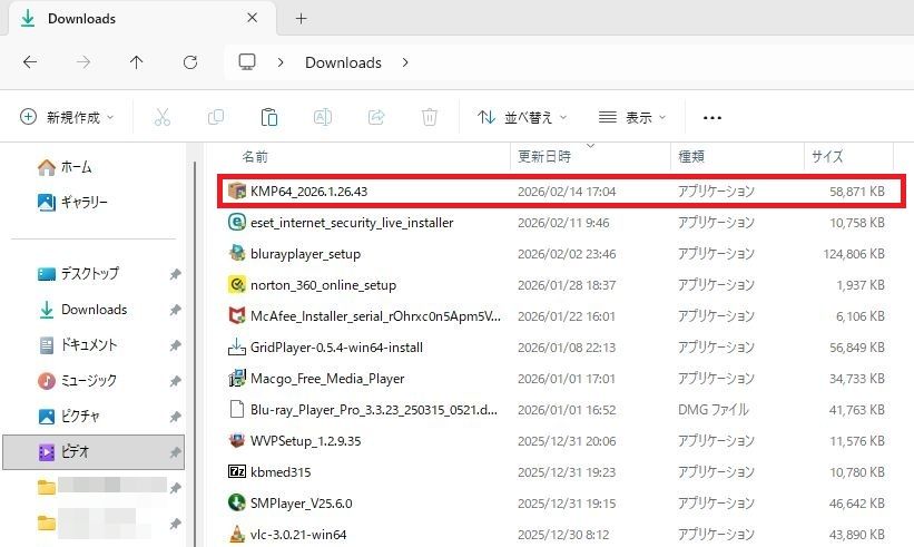 ダウンロードをおこなったインストールファイルKMP64_2026.1.26.43を1回左クリックしてください。