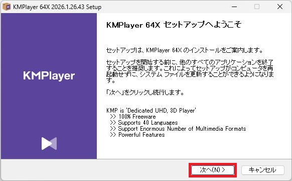 KMPlayerセットアップウィザードが開始されます。次へを1回左クリックしてください。