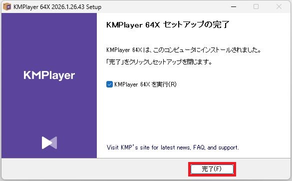 KMPlayer 64Xのインストールが完了しました。 KMPlayer 64xを実行という□にチェックが入っている状態で完了を1回左クリックするとKMplayer ソフトが起動します。