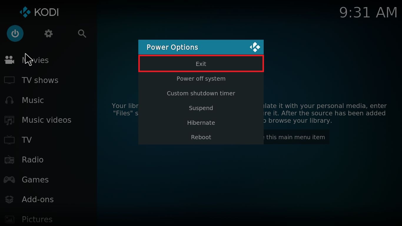 「Exit」を選択(1回左クリックしてください)この方法の場合はkodiソフトウェアのみが終了します。