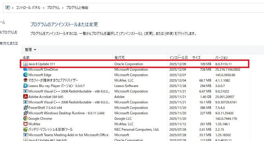 Java8 update3.11も同様にLeawo-Blu-ray-Player関連です。アンインストールをおこなう「Java8 update3.11」が水色に表示がされていない場合は「Java8 update3.11」を1回左クリックしてください。