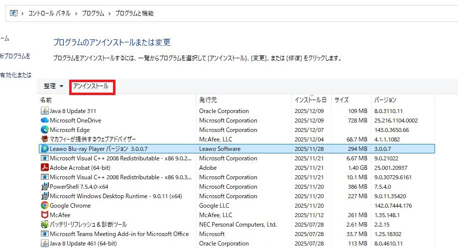 「Leawo-Blu-ray-Player」の表示が水色になった状態で「アンインストール」を1回左クリックしてください。