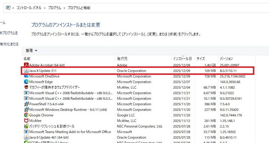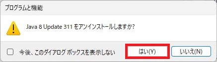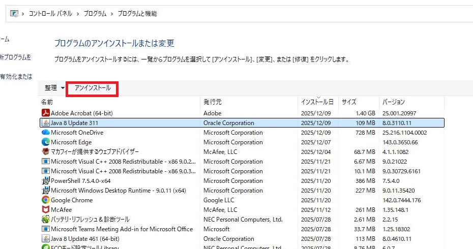 「Java8 update3.11」の表示が水色になった状態で「アンインストール」を1回左クリックしてください。