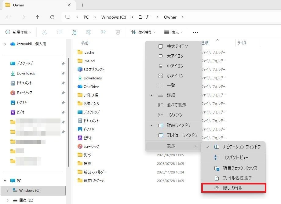 右に表示されたメニューから「隠しファイル」を1回左クリックしてください。