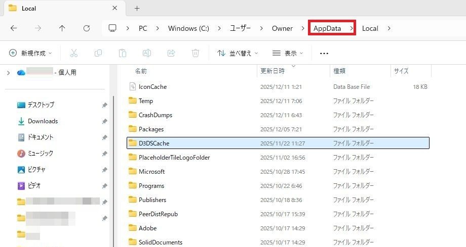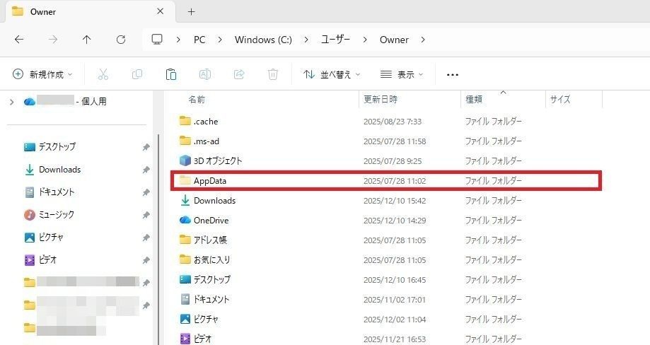 関連したフォルダはAppDataフォルダの中にありますが、AppDataフォルダは表示がされていない状態になっています。