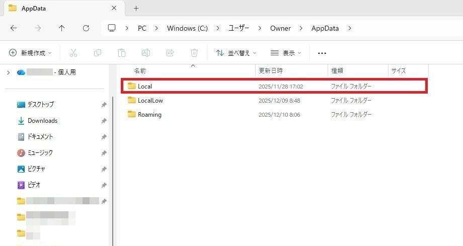 AppDataフォルダが表示されます。「AppDataフォルダ」を2連続で左クリックしてください。