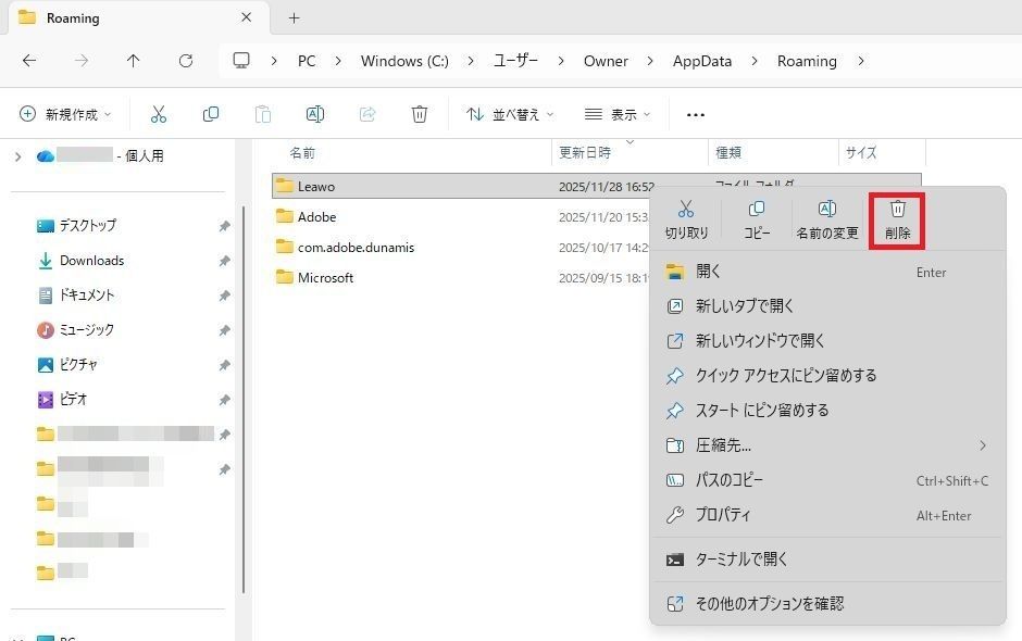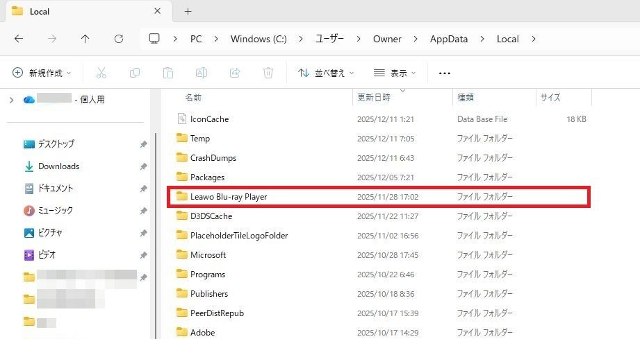 localのLeawo-Blu-ray-Playerフォルダの削除