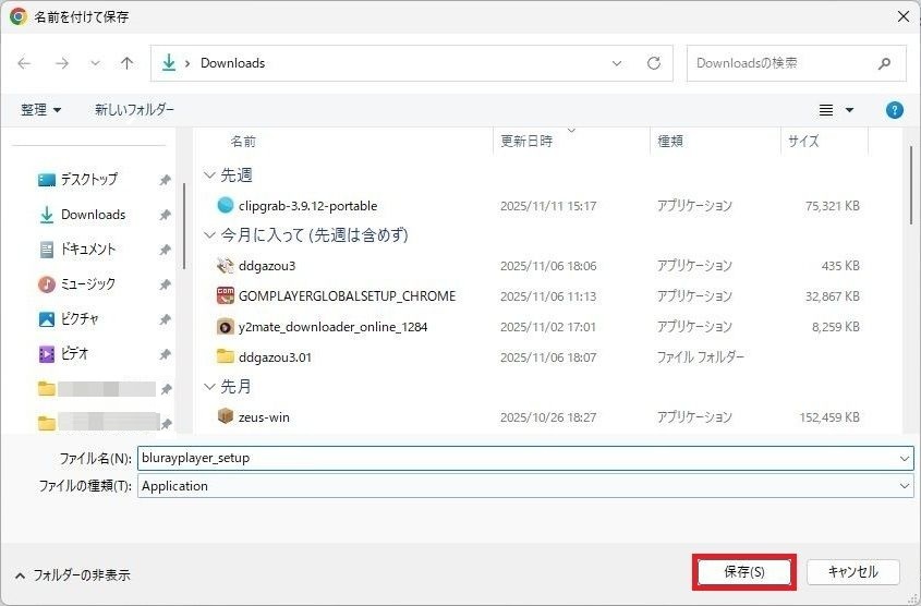blurayplayer_setupファイルのダウンロードをおこないます「保存」を1回左クリックしてください。
