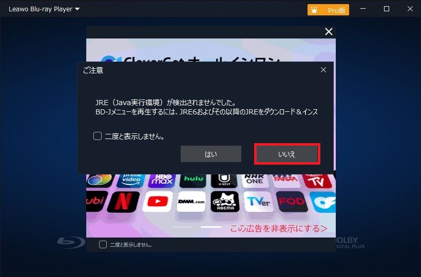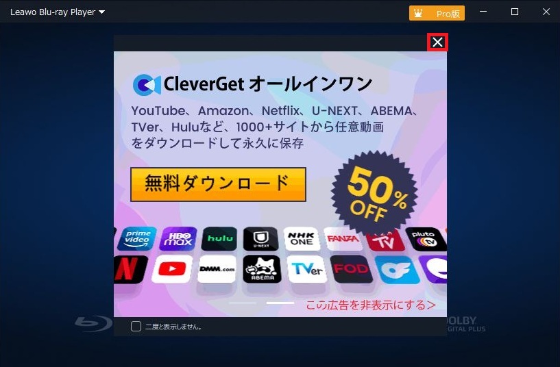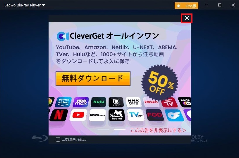 - Leawo Blu-ray Playerの起動をおこなった際に広告が表示されます。対策として右上の×を1回左クリックすると広告の表示は消えます。