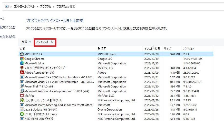 「MPC-HC」の表示が水色になった状態で「アンインストール」を1回左クリックしてください。