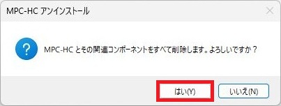 MPC-HCとその関連コンポネートをすべて削除します。よろしいですか?「はい」を1回左クリックしてください。