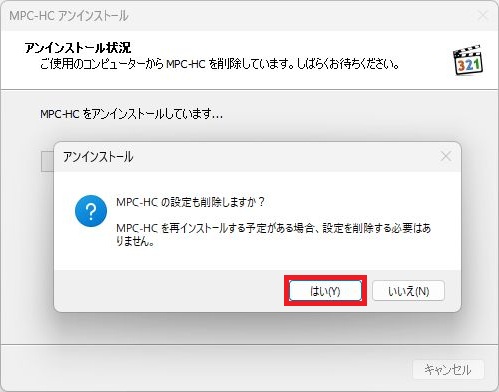 MPC-HCの設定を削除しますか?MPC-HCを再インストールする予定がある場合、設定削除数r必要はありません。「はい」(削除する)を1回左クリックしてください。