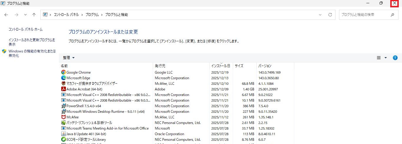 Windows10をご利用されている方は、基本的なアンインストール画面までの移動方法、関連フォルダの削除画面までの移動方法を別に作成していますので、こちらのページをご覧ください。