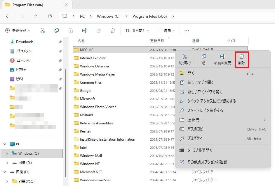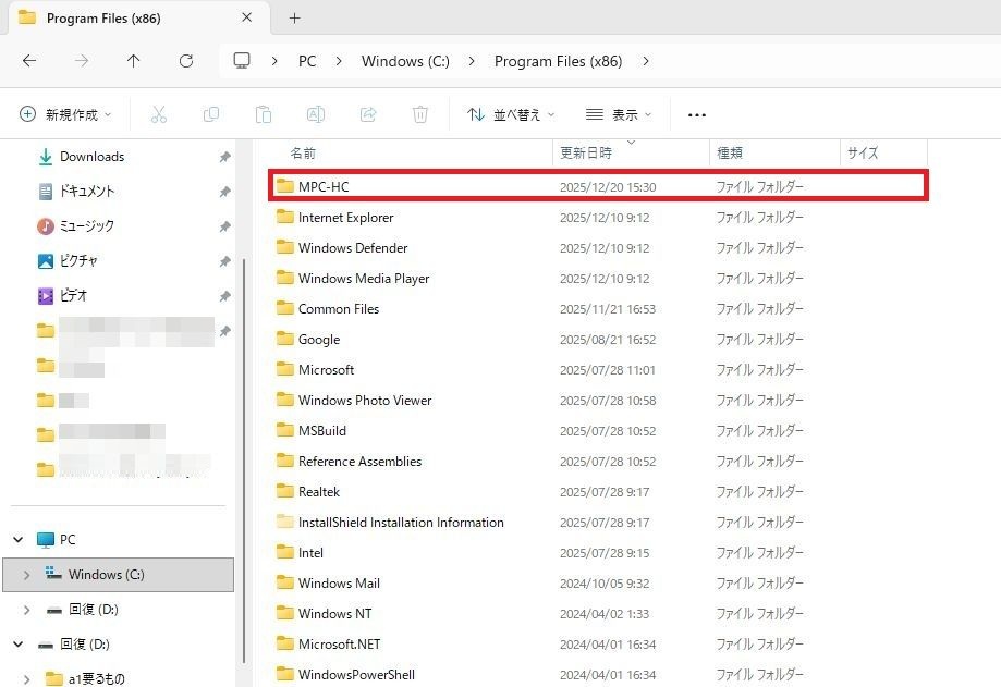 Windows10、Windows11で不要になったMPC-HC(Media Player Classic -Homecinema)のアンインストール方法及び関連フォルダ(MPC-HCという名称)の削除方法をご紹介しています。