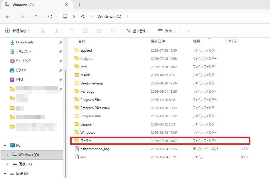上側もしくは左側の「Windows(C:)」を1回左クリックしてください。