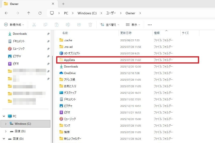 関連したフォルダはAppDataフォルダの中にありますが、AppDataフォルダは表示がされていない状態になっています。