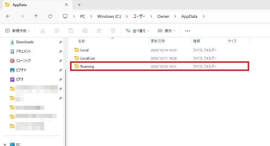 AppDataフォルダが表示されます。「AppDataフォルダ」を2連続で左クリックしてください。