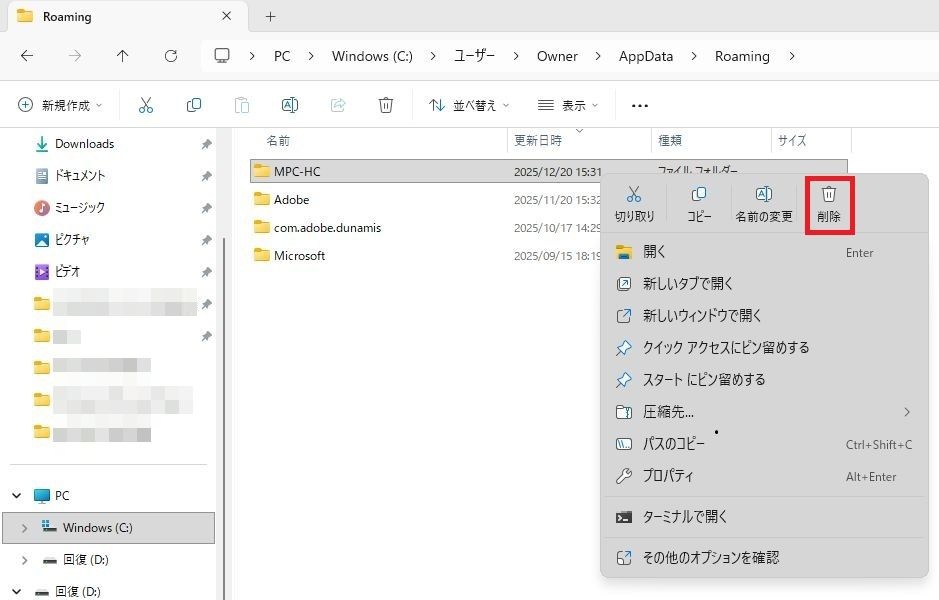 Media Player Classic -Homecinemaアンインストール方法および関連フォルダの削除方法、アンインストールができない場合