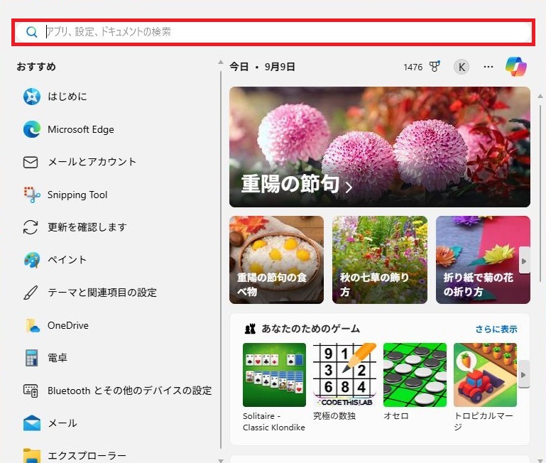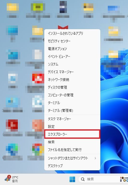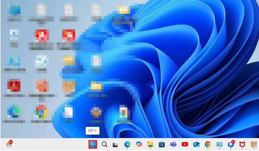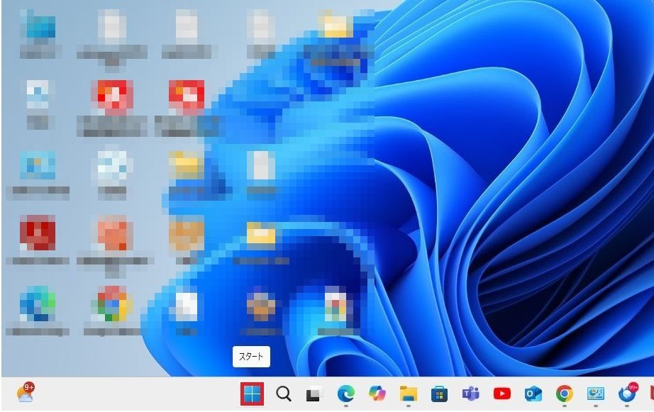 Windows11でSpark(スパーク)メールソフトfor Windowsの関連フォオルダの削除をおこなう場合は、パソコンのデスクトップ画面の左下の「スタート」を1回右クリックしてください。