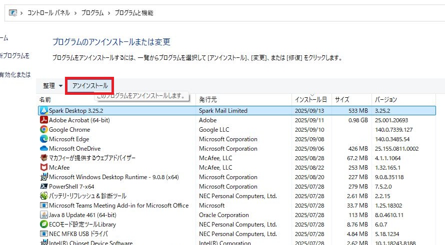 「Spark Desktop 3.25.2」の表示が水色になった状態で「アンインストール」を1回左クリックしてください。