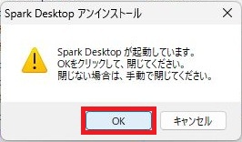 Spark Desktopが起動されている場合は以下の表示がされます。「OK」を1回左クリックしてください。これで削除はされますので問題ありません。