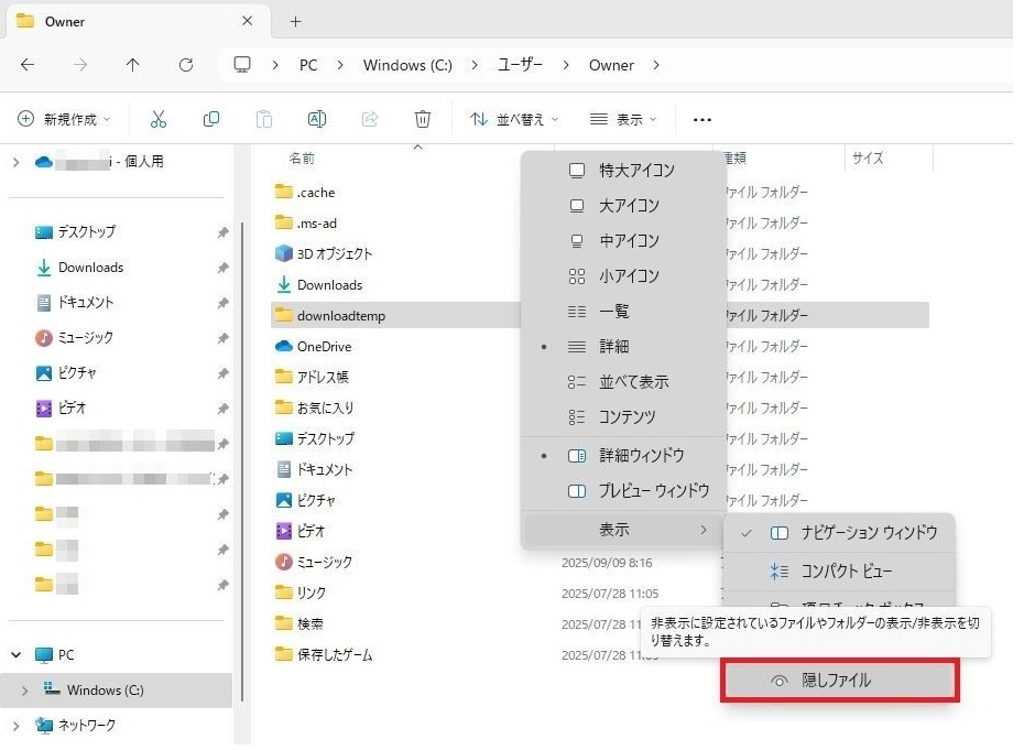 右に表示されたメニューから「隠しファイル」を1回左クリックしてください。