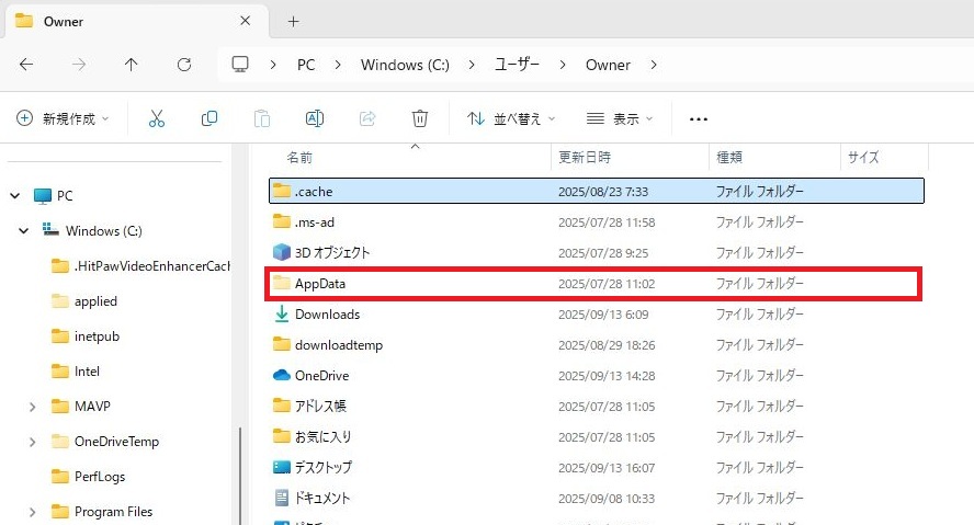 関連したフォルダはAppDataフォルダの中にありますが、AppDataフォルダは表示がされていない状態になっています。